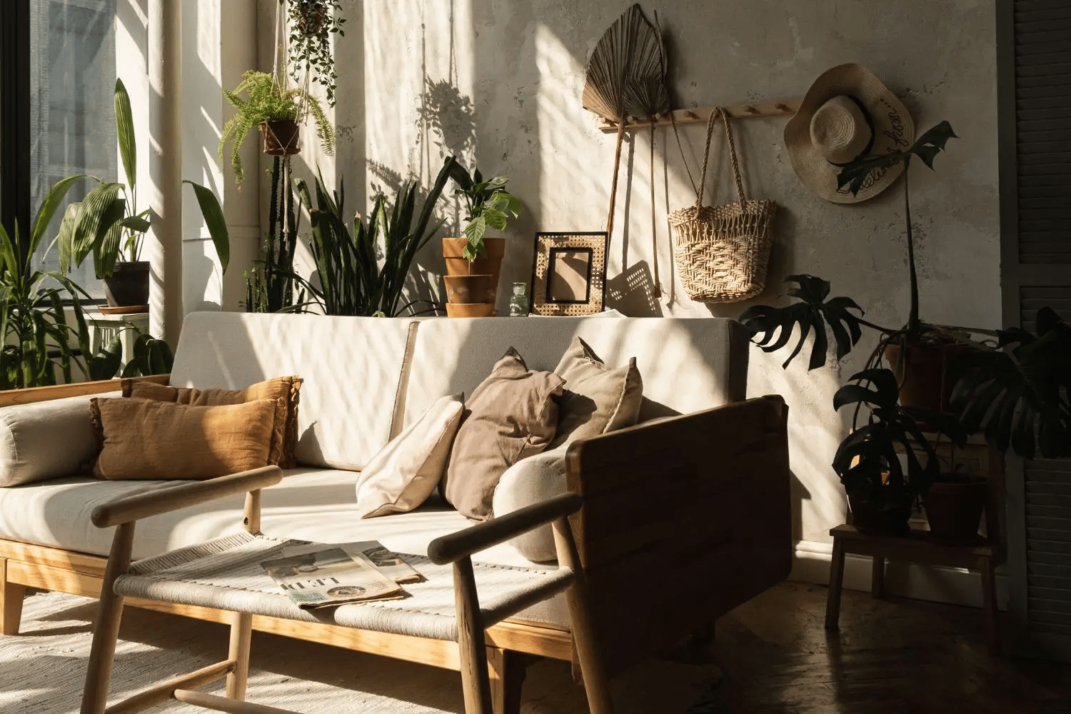 A beautifully styled living space featuring globally sourced home decor, including rattan furniture, woven baskets, and indoor greenery—perfect for incorporating international design elements into your home.