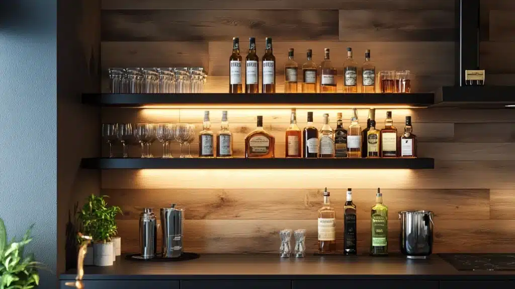 That’s what wall-mounted bar shelves with storage give you. They’re like the Swiss Army knife of bar setups.