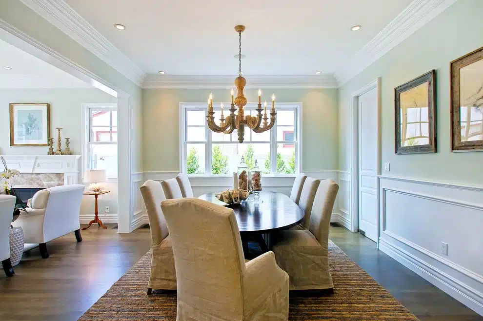 Design a classy and stylish look in your space by using white molding that matches your coffered ceiling. The chair rail molding adds a nice touch and makes the walls more interesting. Pair it with a coffered ceiling system that has attached panels and white trim for a stuck design. The white color of the chair rail and ceiling makes the room feel bright and broad. This combination is popular in traditional and temporary homes, giving your dining room a beauty charm.