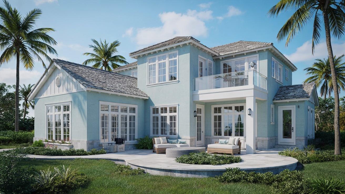 5. Light Blue Stucco with White Trim