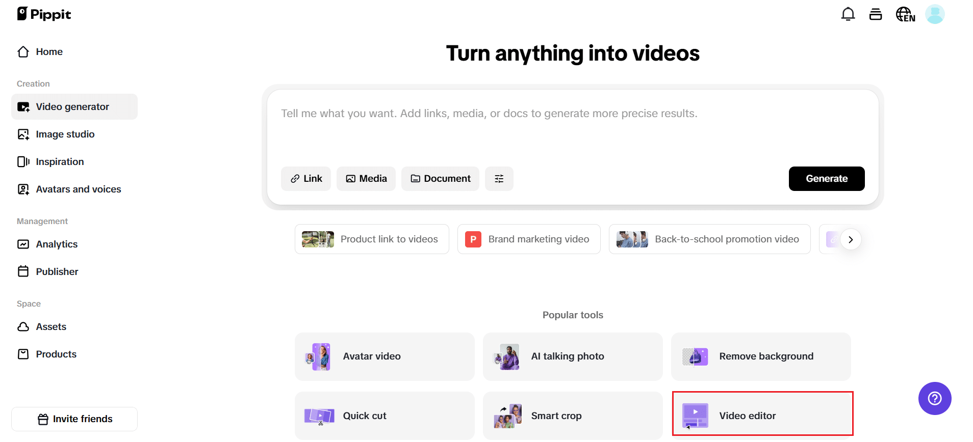 Log in to Pippit and select ‘Video generator.’ To easily and precisely enhance your videos of your favourite sound waves, click ‘Video editor‘ and use the ‘Popular tools.‘ You can begin your creative journey and explore robust tools and features with just a single click.