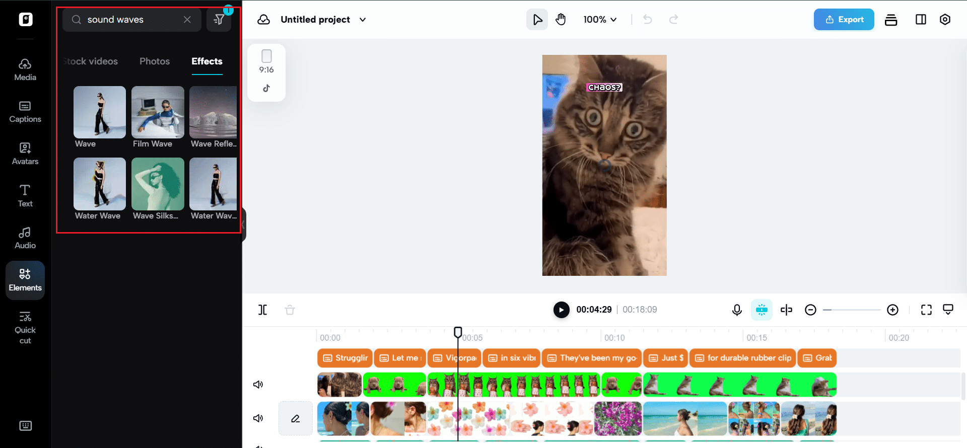 A screen where you can drag and drop or upload your video will then appear. Type ‘sound waves‘ into the search field after it has been uploaded, then click the elements button on the left side of the screen. Choose from a range of sound wave templates by pressing Enter. Choose one that appeals to you and alter it to reflect your artistic vision. The soundwave can be adjusted to your needs.