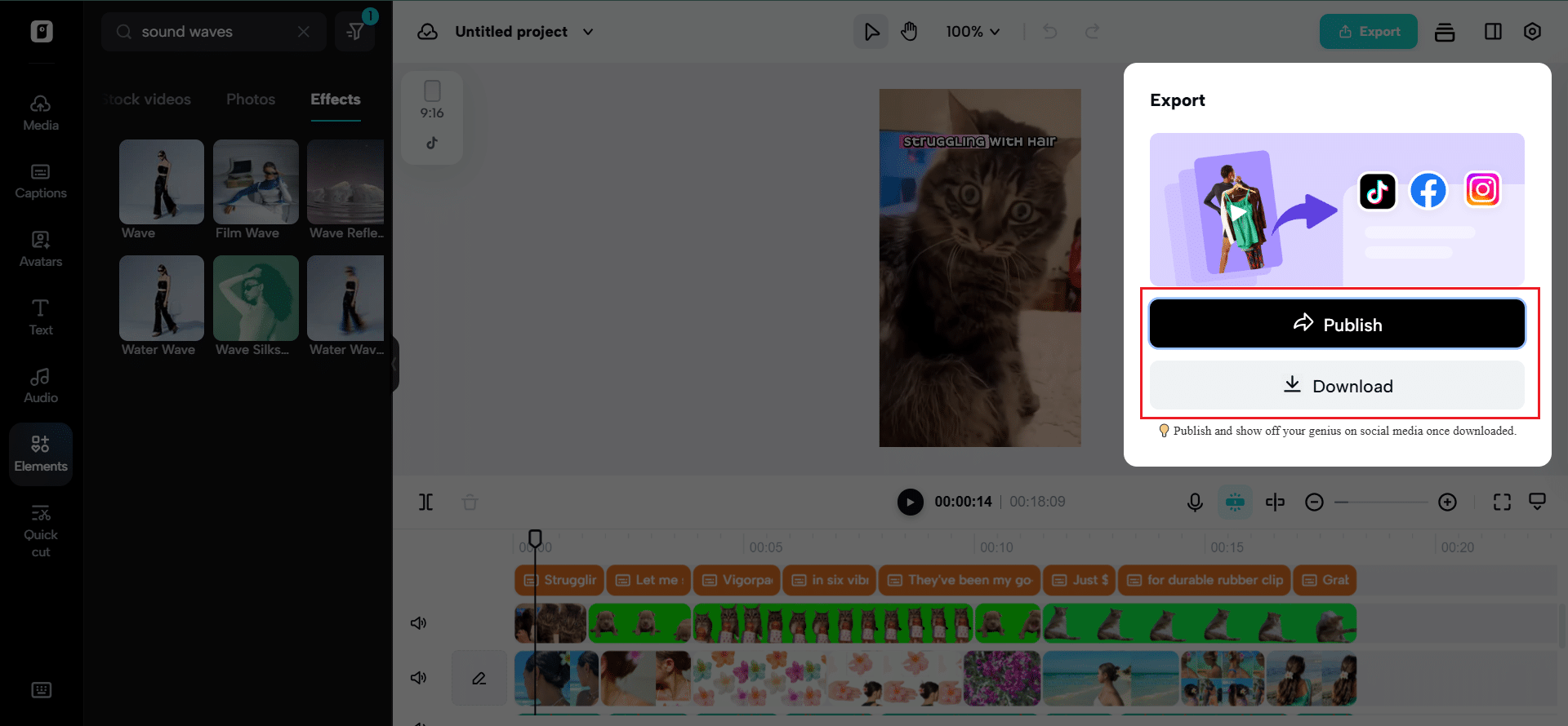 After you’re happy with your edits, click ‘Export‘ to select ‘Publish‘ to share your video automatically on Facebook, Instagram, or TikTok, or click ‘Download‘ to save it directly to your device. Finalise the format, frame rate, resolution, and quality options. It’s time for your viewers to see your video.