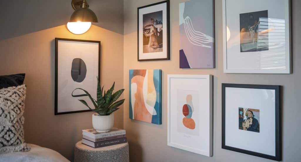 Turn your corner into a creative showcase with an artistic gallery wall. Hang framed photos, artwork, or canvas pieces at staggered levels for a vibrant look—mix sizes and frame styles for a more curated, eclectic feel.