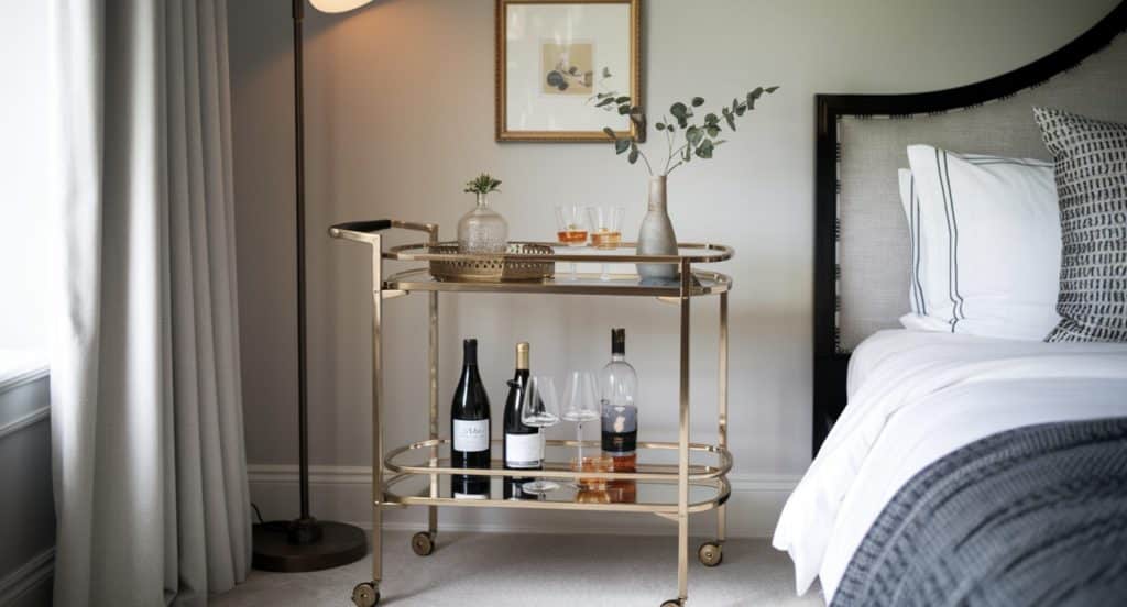Design a sophisticated corner mini bar with a stylish bar cart or small cabinet to organize your drink essentials.