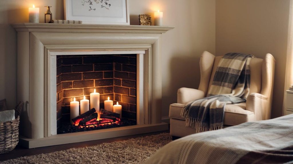 Bring warmth and grace to your corner with an electric or faux fireplace. Surround the setup with decorative logs, candles, or a small mantelpiece to display photos or decor items.
