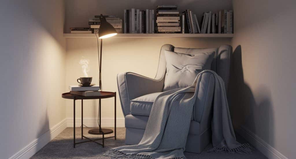 Add a side table for your favorite books, a warm beverage, and a floor lamp for gentle lighting.