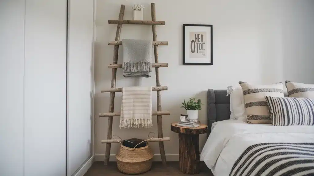 Add visual interest with a decorative ladder placed neatly in your bedroom corner.