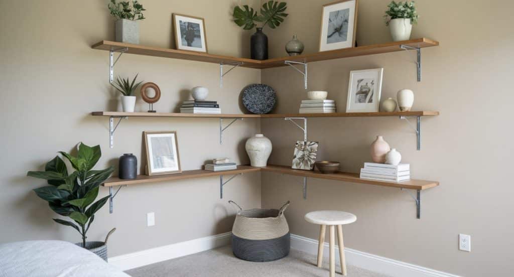Make the most of your corner with floating shelves to display art pieces, plants, books, or collectibles.