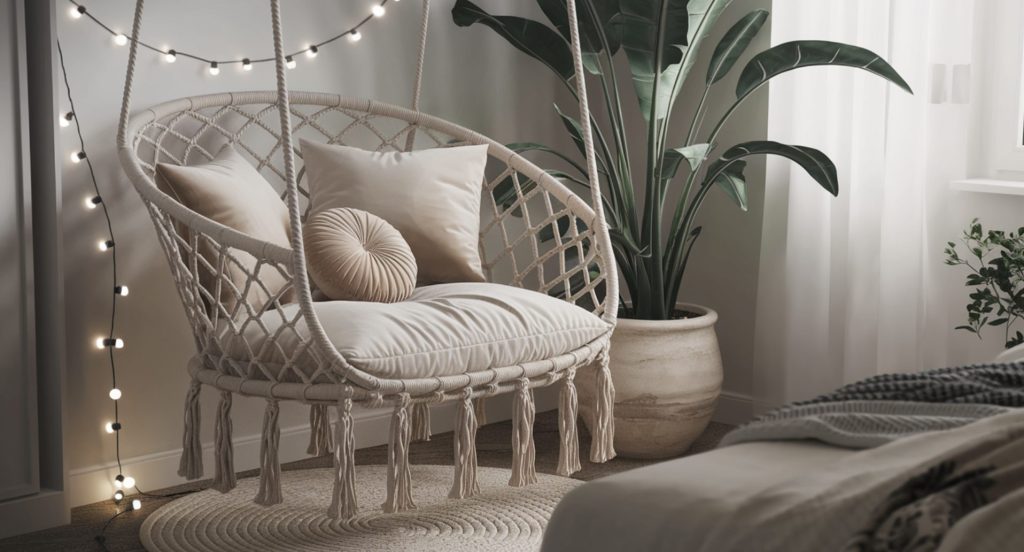 Add a playful yet relaxing feature to your bedroom corner with a hanging swing chair. Choose a macramé or rattan design for a bohemian vibe, and style it with a cozy cushion and a throw pillow.