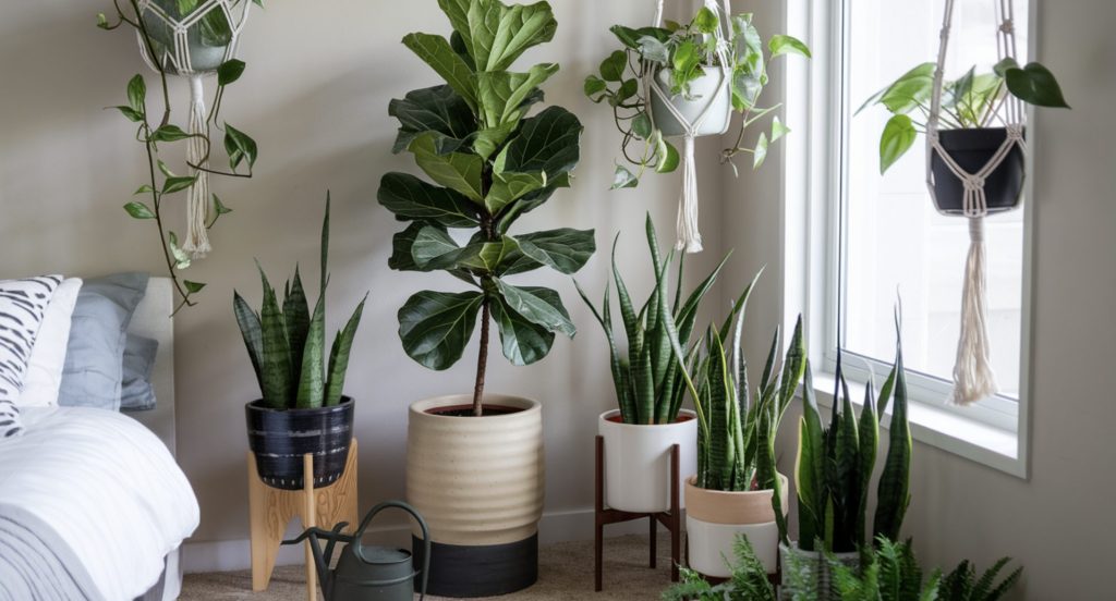 Brighten your bedroom corner with tall, small indoor plants like fiddle-leaf figs, snake plants, or ferns.