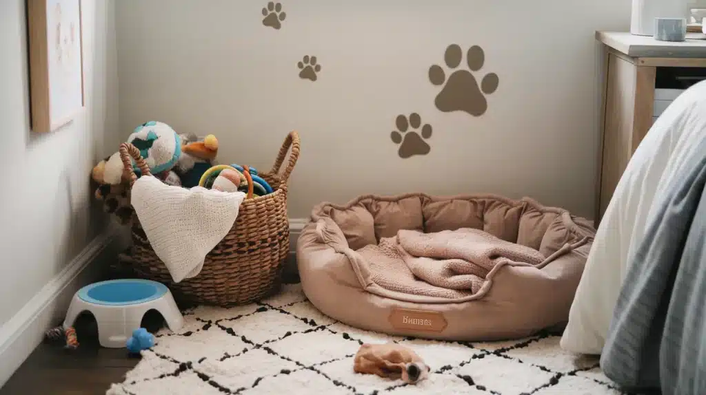 Give your furry friend their special corner with a cozy pet bed, soft blankets, and a small toy basket.