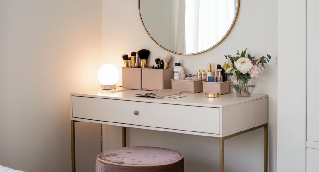 Pair it with a comfy stool or bench, and use organizers to keep your makeup and skincare essentials tidy.