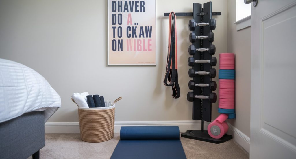 In your bedroom corner, you can create a functional fitness space with a yoga mat, dumbbells, and resistance bands. To organize the equipment neatly, use a small vertical rack or baskets.