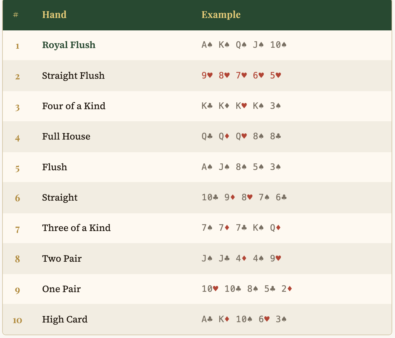 7 Card Stud uses standard poker hand rankings — the same ten combinations found across most poker variants. Since you receive seven cards in total, you always select the best possible five-card combination to go to showdown with. Knowing these hands cold is non-negotiable: misreading your own hand at the river is a costly mistake that even experienced players occasionally make.