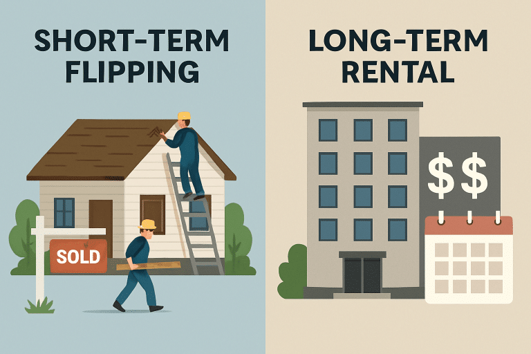 The debate between short-term gains and long-term strategies in real estate investment boils down to one’s financial goals, risk tolerance, and commitment of both time and resources. While flipping properties can provide fast returns, these come with greater risk and tax burdens.