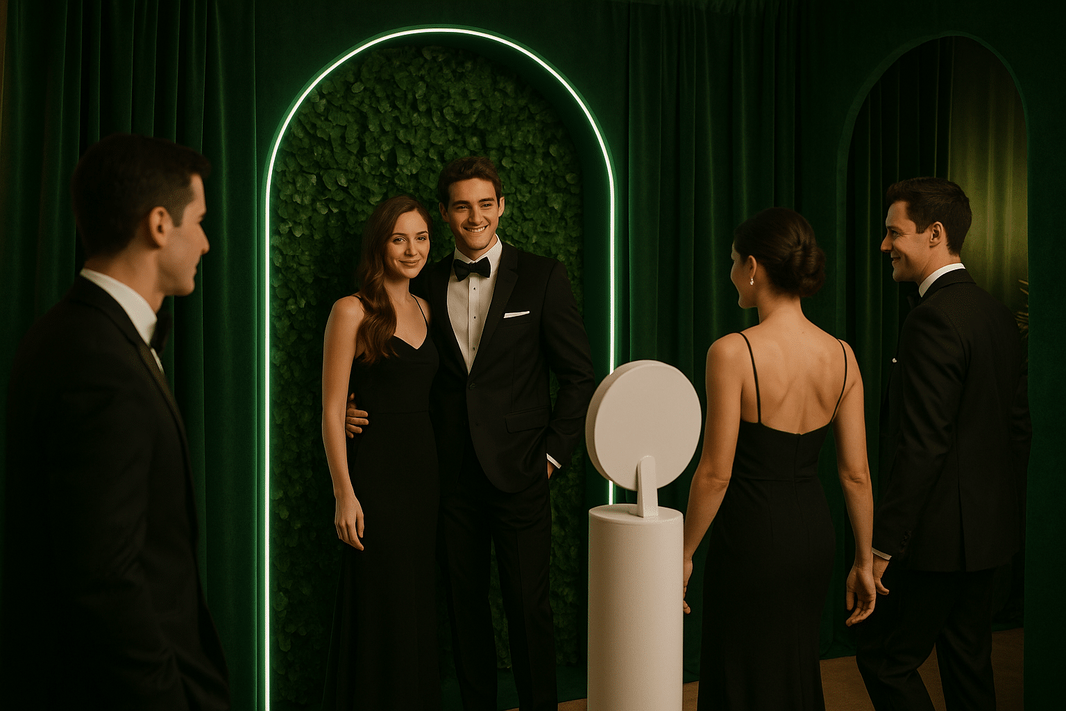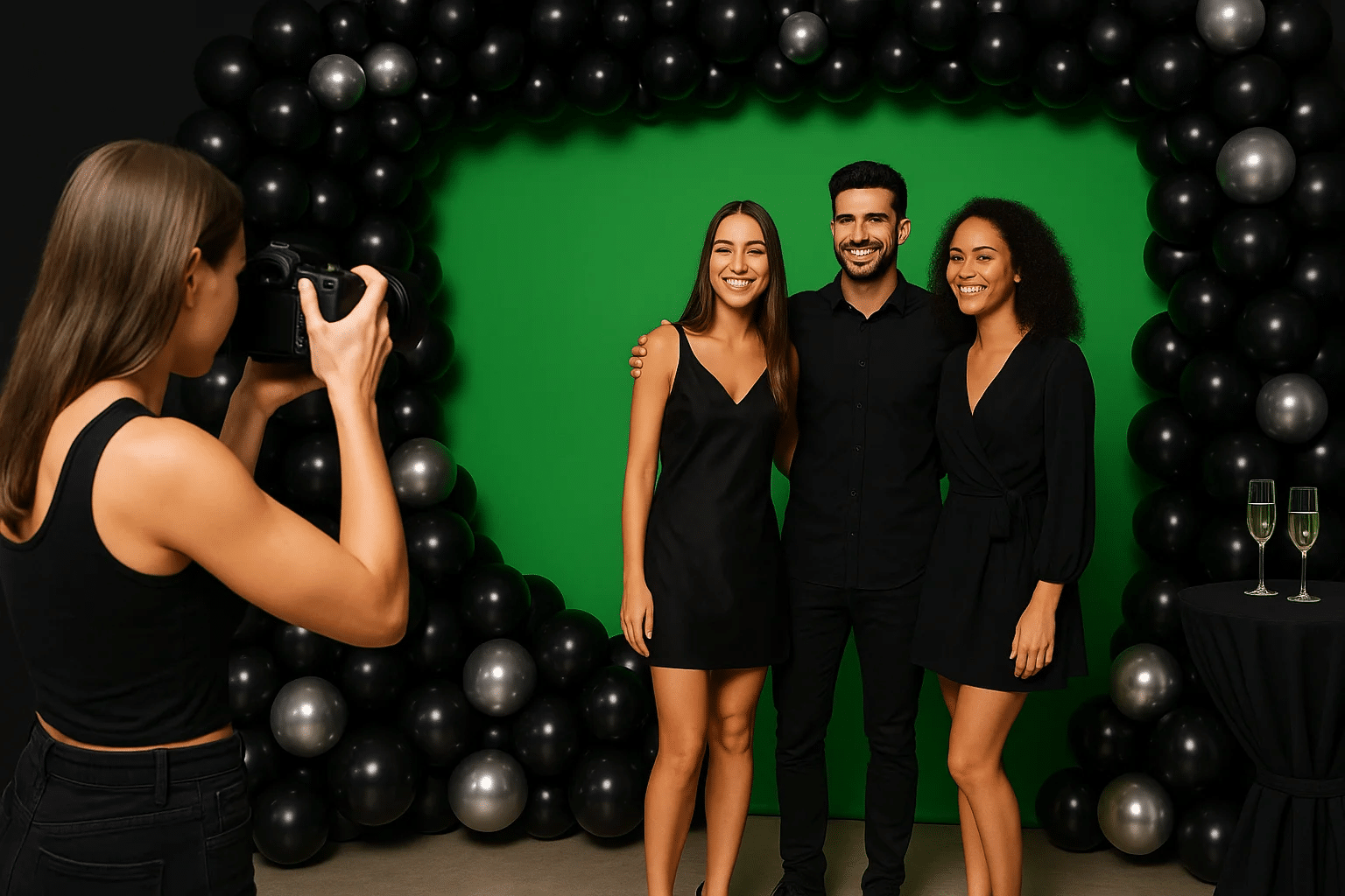 Imagine this: your guests mingle, enjoying the ambiance of your chic black-themed party, when they walk past a photo booth that transports them into a new world. With a green screen setup, you can offer them an unforgettable experience where they can step into customized, themed backgrounds that match the vibe of your event. This makes for fun memories and lets you create shareable, personalized moments for your guests.