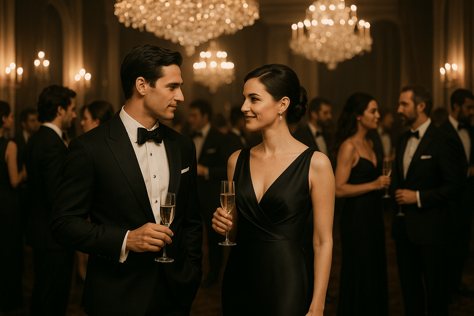- Black Tie Affair: This is ideal for an upscale event. Guests dress in tuxedos, gowns, and cocktail dresses—all in black. Enhance the elegance with gold or silver accents in decor, lighting, and table settings. Black velvet tablecloths, fine crystal, and metallic candles complete the luxurious atmosphere, making guests feel at a gala.