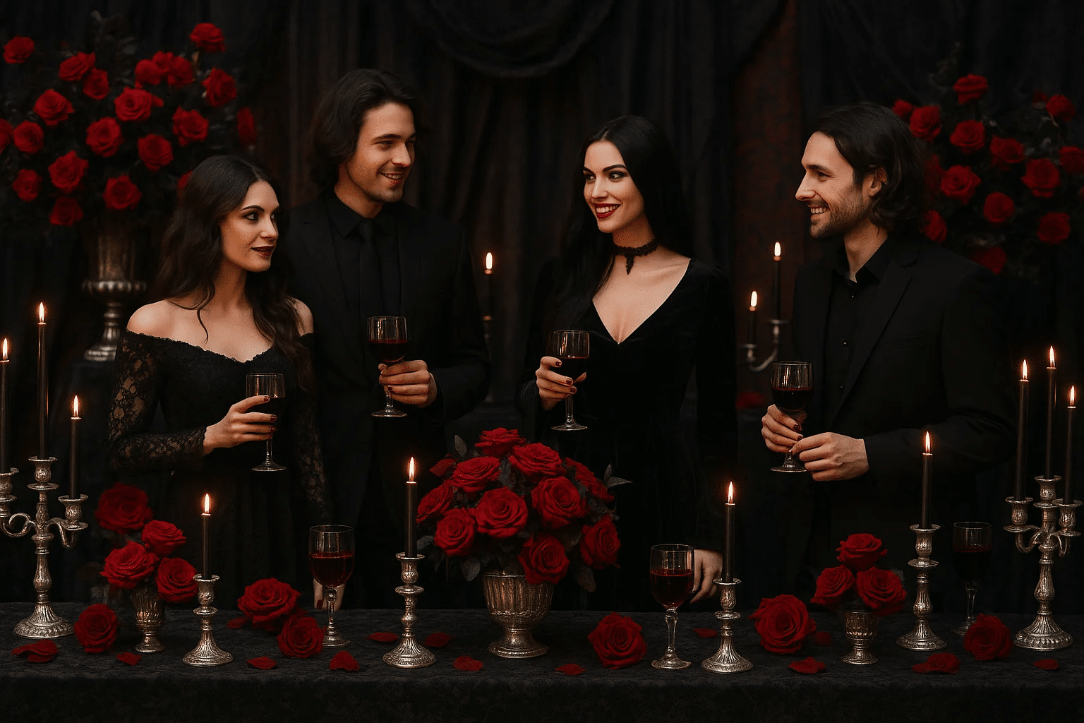 - Gothic Elegance: Dark and moody, a Gothic Elegance theme exudes mystery. Think black velvet, deep red accents, and candlelit settings. Add Victorian-inspired decor with ornate candleholders and antique furnishings. Red roses, black lace, and silver details enhance the gothic charm. An eerie classical playlist will transport guests to another time.