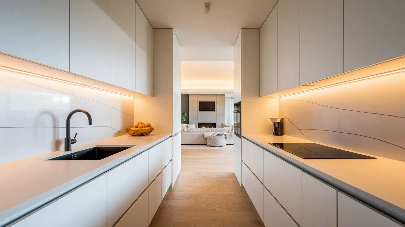 Use quartz to cover the entire wall for a seamless, contemporary appearance. This approach works best in open kitchens, creating maximum visual impact.