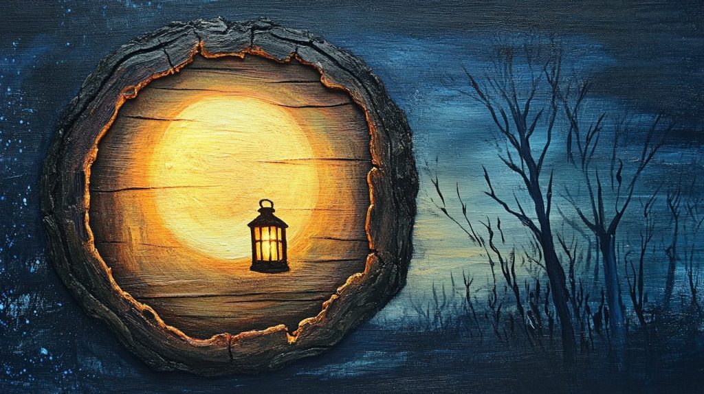 Luminous Lantern Motifs feature delicate lanterns painted or burned into wood slices, casting a glow of festive lights through painted glass panels.