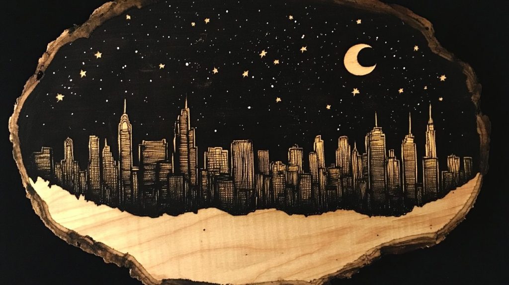 • Sketch the Skyline: Draw or transfer a city skyline onto the wood.
