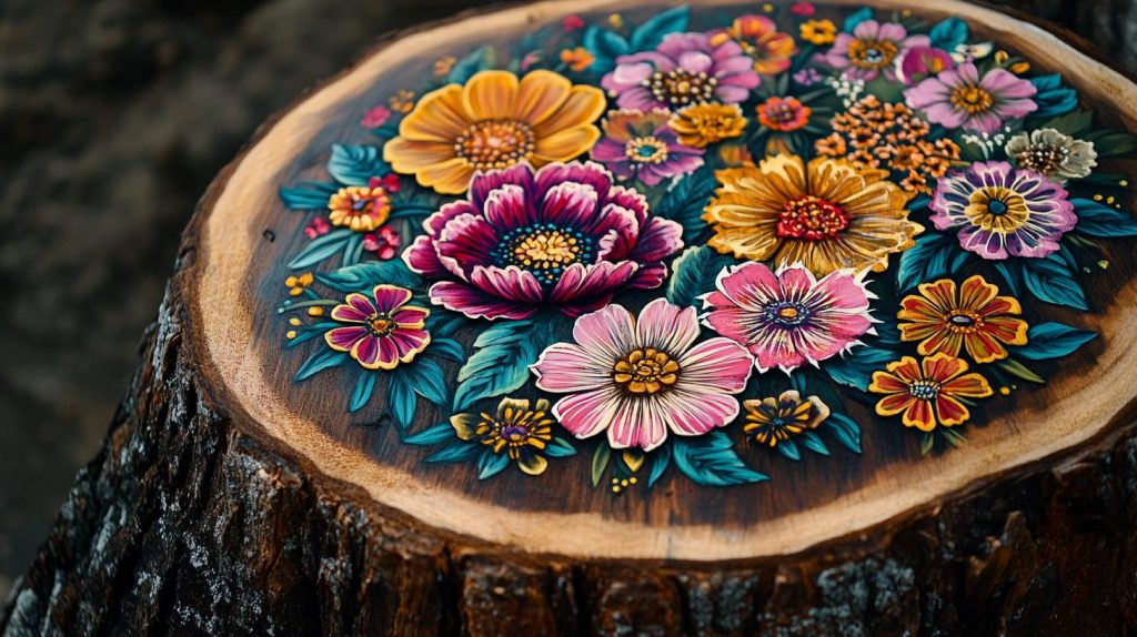 Ornate Floral Decorations bring a touch of spring to the winter season, with detailed floral patterns beautifully crafted on wood slices.