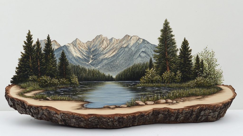 Tranquil Nature Scenes offer a peaceful glimpse into the natural world, with landscapes of forests, lakes, and mountains delicately illustrated on wood slices.