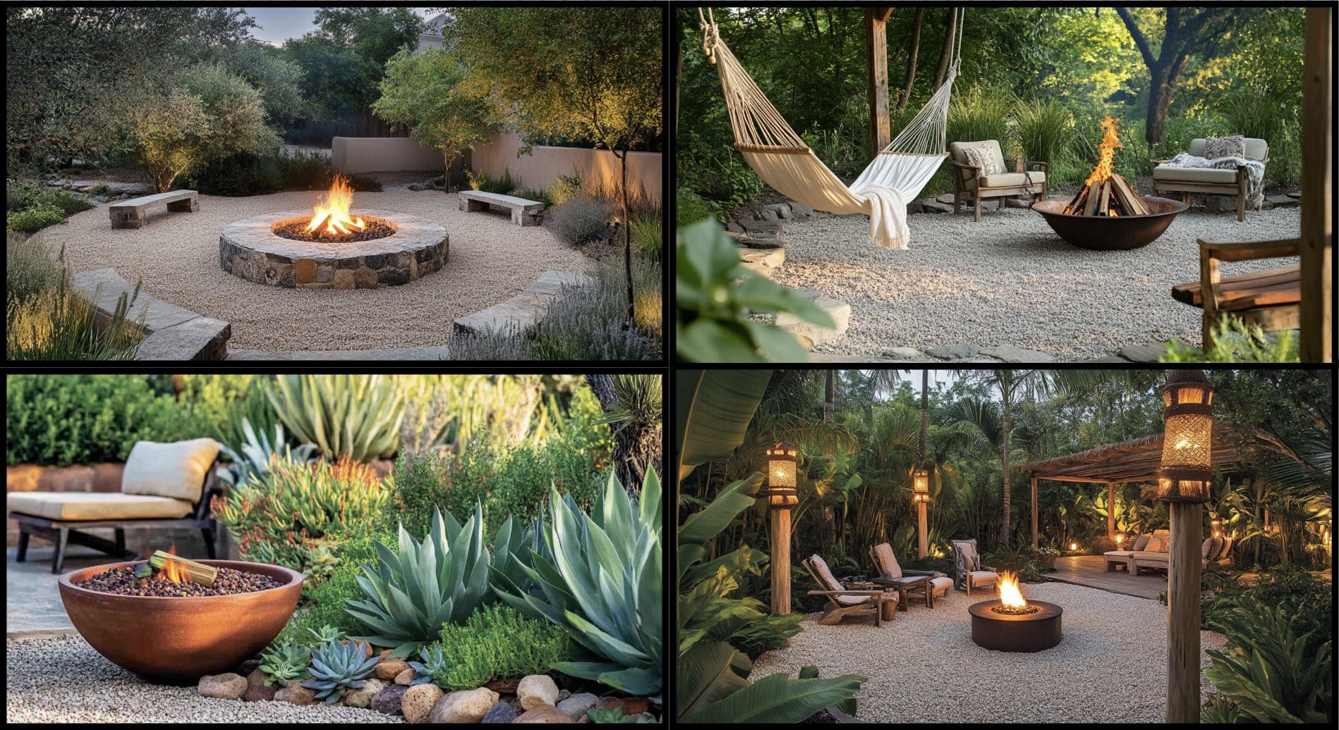 - Add the fire pit: Position a fire bowl or built-in fire pit centrally.