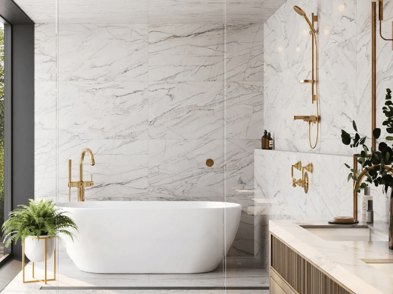 A more budget-friendly approach to achieve the refined look of marble without the trouble is to use an imitation marble bathroom tile, which is often composed of porcelain.