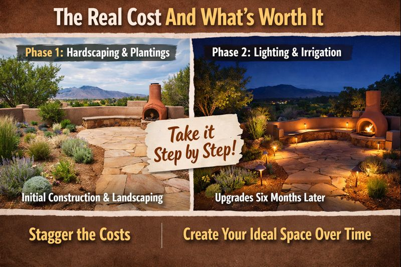 Quality outdoor projects in Santa Fe start around $20,000 for basic improvements. Professional design work runs $3,000 to $18,000, depending on complexity, and installation, materials, and specialized features add up quickly.
