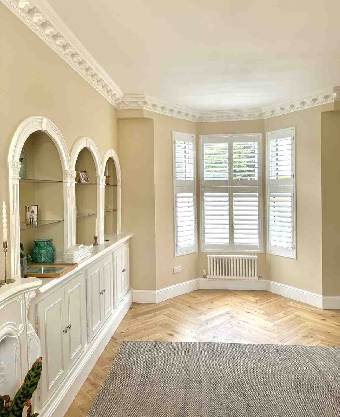 Installing Bay Window Shutters across that curved expanse helps seal out the cold, as each panel is custom-made for the bay’s unique angles to eliminate draughts.