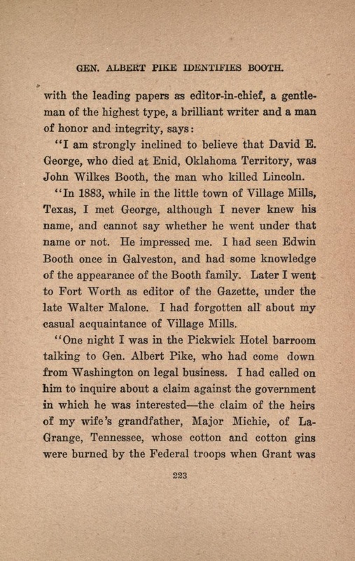 The Suicide of David Elihu George David E. George David Elihu George Enid Wave published in its January 13, 1903 afternoon edition a one paragraph article about the David E. George suicide. A local pastor, Rev. E.C. Harper, brought the nickel paper home and read the headline to his wife Jessica. The couple had moved to Enid just a year earlier from ," wishing to clear his conscience of "killing the greatest man who ever lived." Mr. George, would eventually recover from his serious illness of 1900, and continued to work in El Reno, never mentioning again his alleged real identity. Mrs. Harper and others in El Reno, including Rev. E.C. Harper, dismissed the George's 1900 'Booth confession' as either the delusions of a sick man or the deception of an insane man. The Grand Hotel, Enid, Oklahoma today Upon reading the Enid newspaper account of David E. George's suicide that Tuesday evening, January 13, 1903, the Harpers wondered if this "David E. George" who died earlier that morning at the Grand Hotel could be the same David George they had known in El Reno. Mr. Harper went down to the town square and "this man confessed to my wife that he was John Wilkes Booth." It was the next day, January 14, 1903, that the Enid newspapers had a field day with the testimony of Rev. and Mrs. Harper. Enid officials Finis Bates Enter Memphis, Tennessee attorney John St. Helen disappeared. Finis Bates would eventually move to Memphis, Tennessee where he became what was then called Attorney General (assistant D.A.). Bates worked for over twenty-five years seeking further information about John St. Helen and/or anybody who claimed to have seen John Wilkes Booth after 1865. In 1900 Finis Bates filed paperwork with the federal government, giving them information from the notes he transcribed during John St. Helen's 1872 "confession." Bates requested that the government's John Wilkes Booth reward money be given to him (Bates) on the premise that the government had made a mistake and killed the wrong man in the barn at Garrett's farm. Bates argued to the government that he (Bates) knew the current identity of Booth (John St. Helen) and that he could help the government capture him. The government sent a form letter back to Bates saying Booth had already been captured and killed.